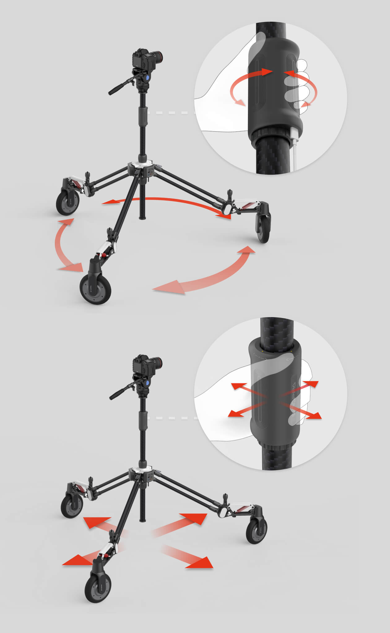 All existing camera dollies currently on the market can only move and shoot on a flat and smooth surface without any damping function. This makes scenarios where camera dollies are used very limited.